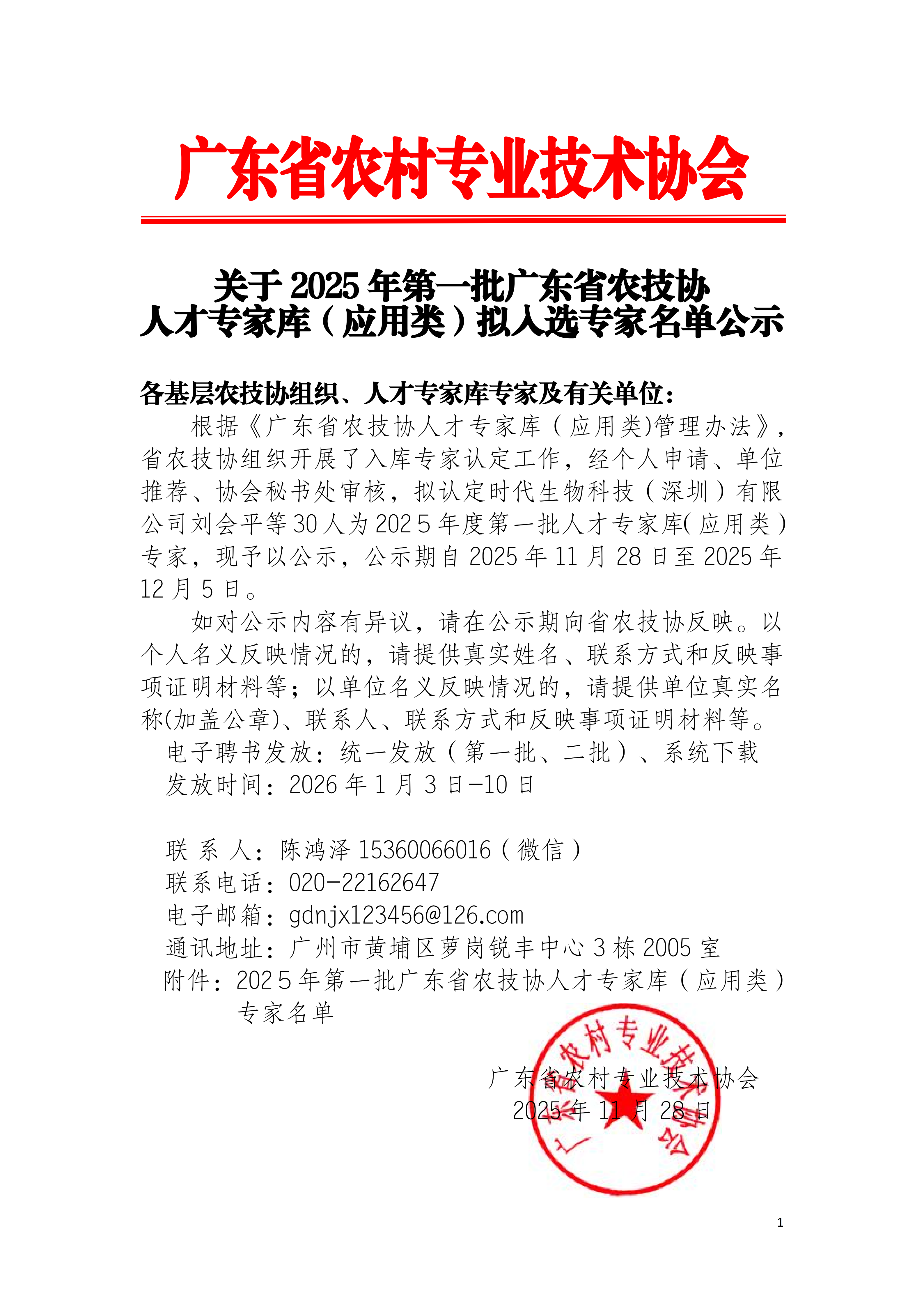 关于2025年第一批广东省农技协 人才专家库(应用类)拟入选专家名单公示