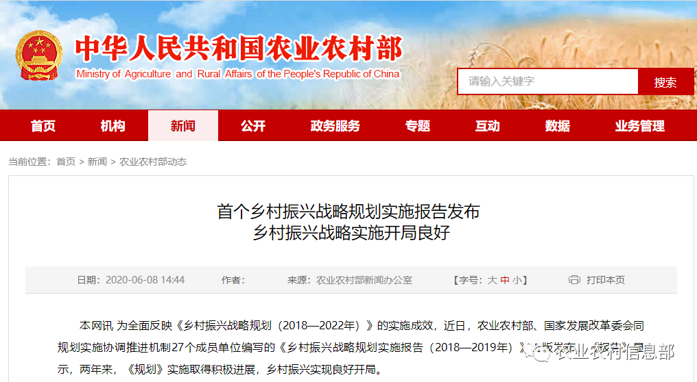 为全面反映《乡村振兴战略规划(2018—2022年)》的实施成效,近日,农业农村部、国家发展改革委会同规划实施协调推进机制27个成员单位编写的《乡村振兴战略规划实施报告(2018—2019年)》出版发布。《报告》显示,两年来,《规划》实施取得积极进展,乡村振兴实现良好开局。
